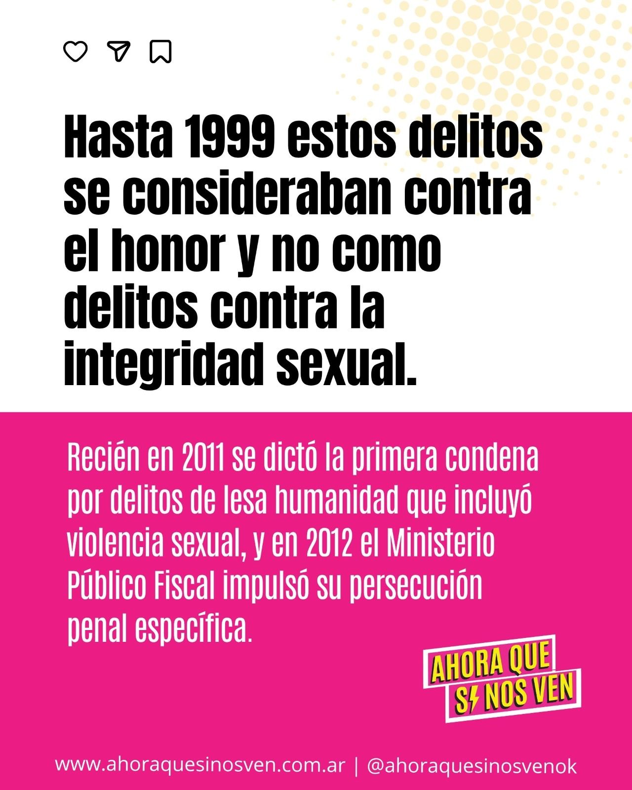 El reconocimiento de la violencia sexual como delito de lesa humanidad, en el marco del plan sistemático de desaparición y exterminio, fue tardío. Hasta 1999 estos delitos se consideraban contra el honor y no como delitos contra la integridad sexual. Sólo 61 de las 361 sentencias dictadas en el país incorporan estos delitos.